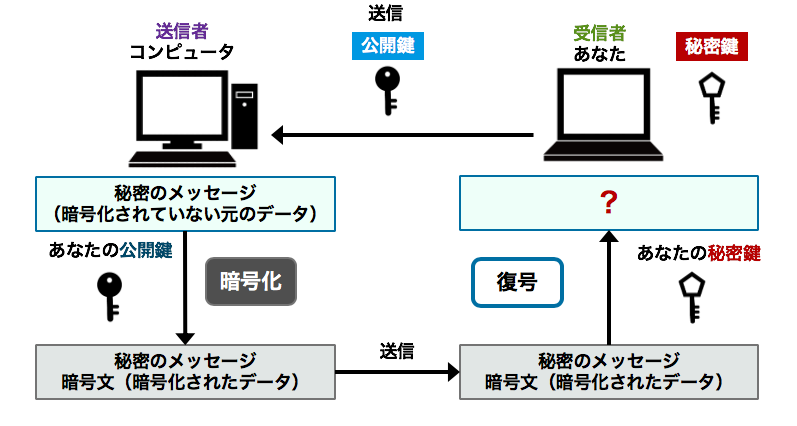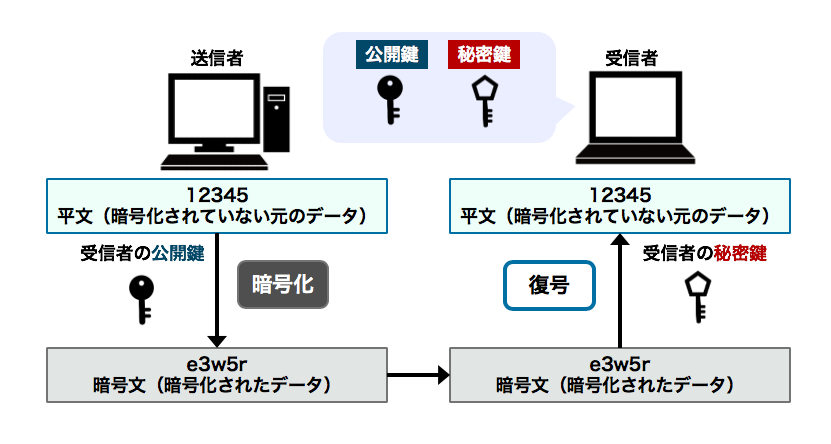 この演習では、公開鍵暗号方式の仕組みを体験的に学びます。公開鍵暗号方式とは、暗号化のために利用する鍵と復号のために利用する鍵が異なる方式です。暗号化に使用する鍵が公開鍵、復号に使用するのが秘密鍵です。