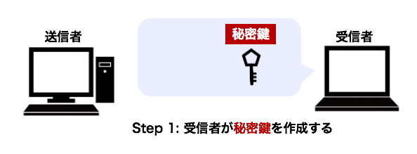 公開鍵暗号方式では、受信者が「公開鍵」と「秘密鍵」のペアの鍵を作成します。 「公開鍵」で暗号化した暗号文はペアの「秘密鍵」でしか復号することができません。まずは【受信者】になったつもりで、「秘密鍵」を作成してみましょう。下のボタンを選択すると、秘密鍵が作成されます。