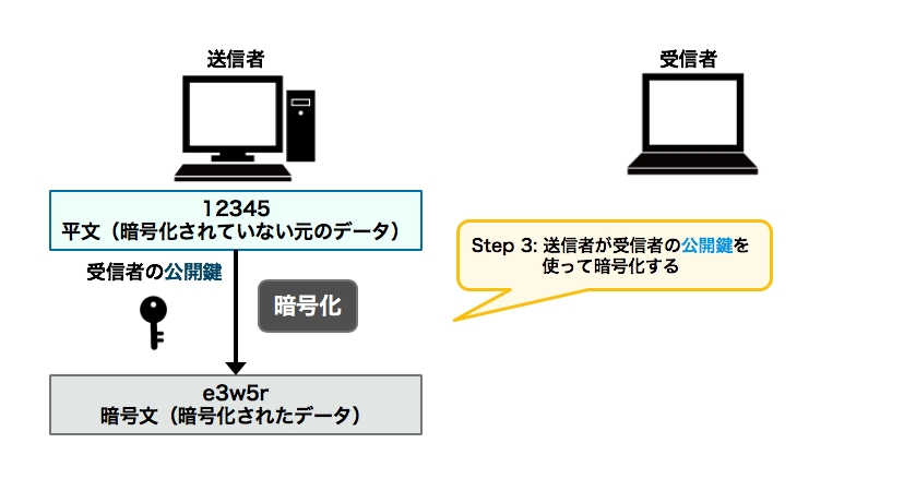 送信者は受信者にデータを送る際、受信者が作成した公開鍵でデータを暗号化し送信します。次は【送信者】になったつもりで、先ほど受信者が作成した公開鍵を使って、送りたいデータ(ここでは文字列)を暗号化してみましょう。