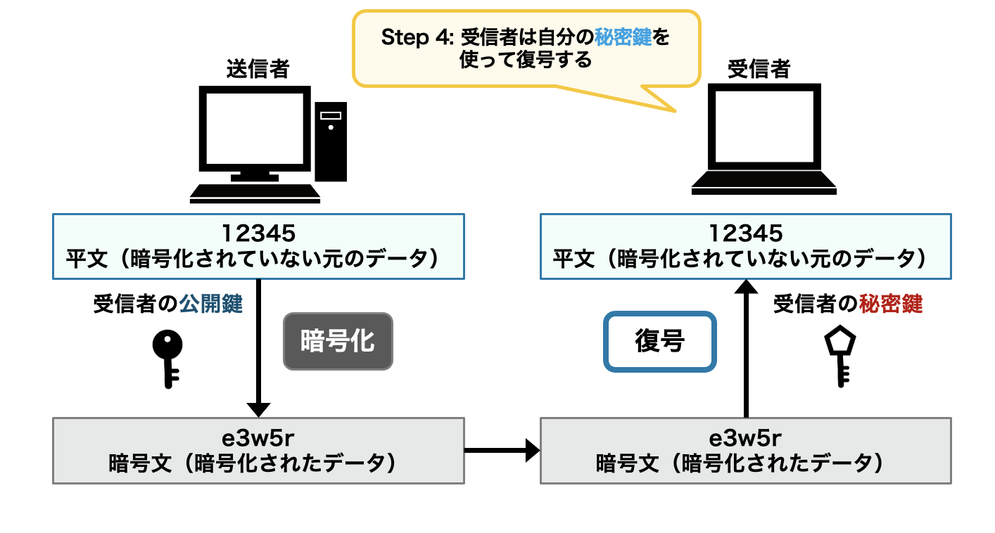 受信者は自分の公開鍵で暗号化したデータを送信者から受け取ります。公開鍵で暗号化されたデータはペアとなる秘密鍵でのみ復号できます。今度は、【受信者】になったつもりで、先ほど暗号化したデータを秘密鍵を使って復号しましょう。